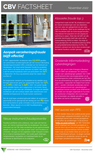 De jaarcijfers zijn gebundeld in de nieuwste CBV Factsheet. Ook bevat deze factsheet meer informatie over het succes van publiek private samenwerking (PPS) in de strijd tegen (verzekerings)criminaliteit, een nieuw instrument voor fraudepreventie én de dienstverlening van het CBV.