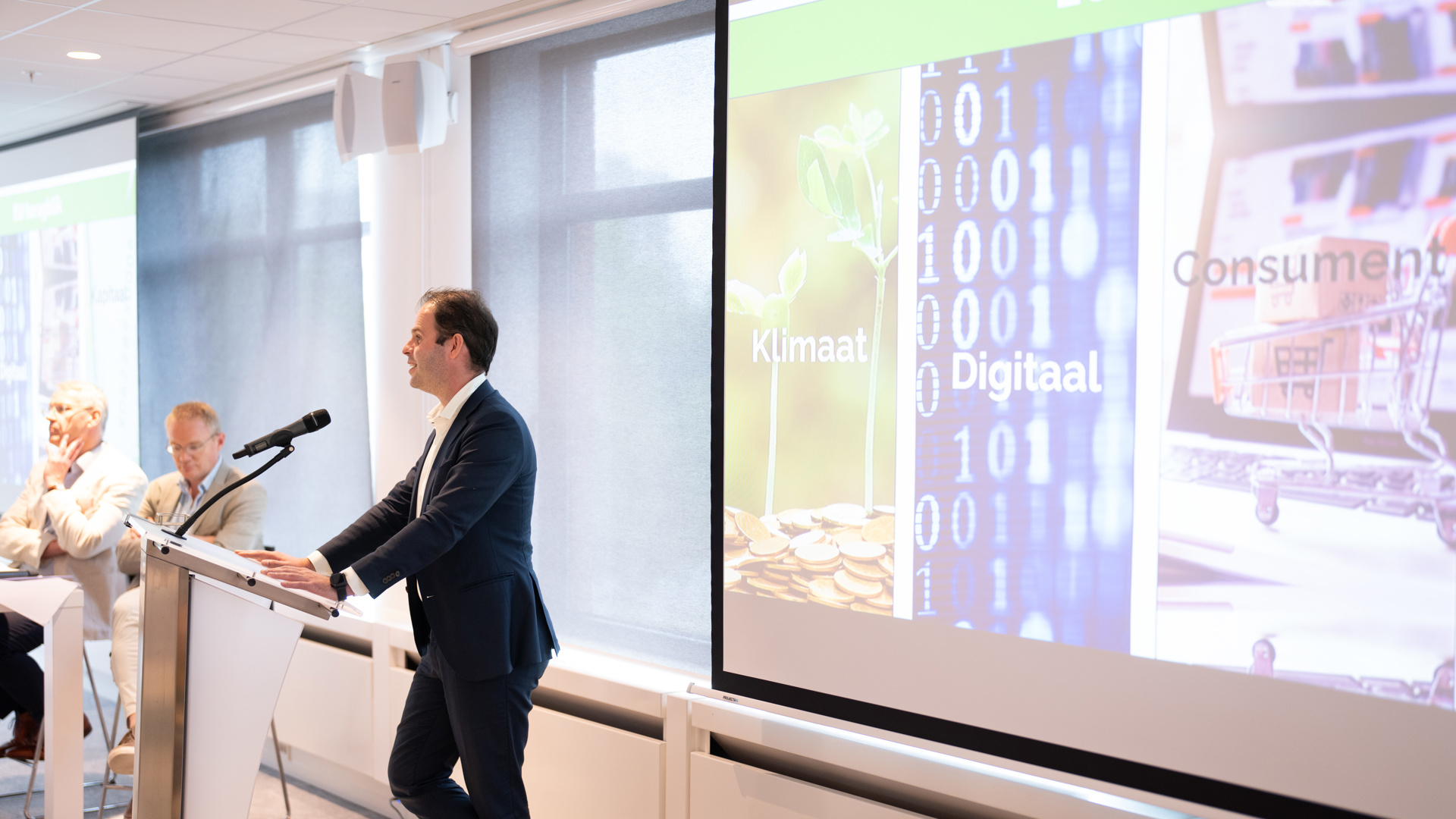 Hij benadrukte dat er, naast verduurzaming en digitalisering, nog drie belangrijke vraagstukken in Brussel op tafel liggen. “De eerste is het concurrentievermogen. Hoe zorgen we ervoor dat de diverse economische sectoren, waaronder de financiële, goed kunnen blijven concurreren. Zowel onderling als met Azië en Amerika. Vijf jaar geleden, bij het aantreden van de huidige commissie, ging het vooral om ‘zo snel en zo groen mogelijk’. Nu willen we ook nog graag kunnen blijven concurreren met landen die wat langzamer vergroenen dan wij.”