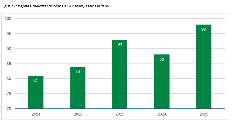 De cijfers laten een sterke verbetering zien ten opzichte van het voorgaande jaar toen 88 procent van de overdrachten binnen de gestelde termijn plaatsvond. Deelnemers aan het Protocol Stroomlijning Kapitaaloverdrachten hebben afgesproken dat de overdragende partij ervoor zorgt dat de verzending van het overdrachtsformulier en de bijbehorende overdracht van het kapitaal uiterlijk op de veertiende dag plaatsvindt nadat alle vereiste documenten door de overdragende partij ontvangen zijn. Het protocol bevat ook afspraken over de rentevergoeding voor de klant als de overdracht langer duurt dan veertien dagen. De voortgang van kapitaaloverdrachten wordt gemeten in de periode april/mei.