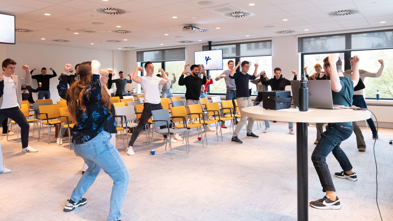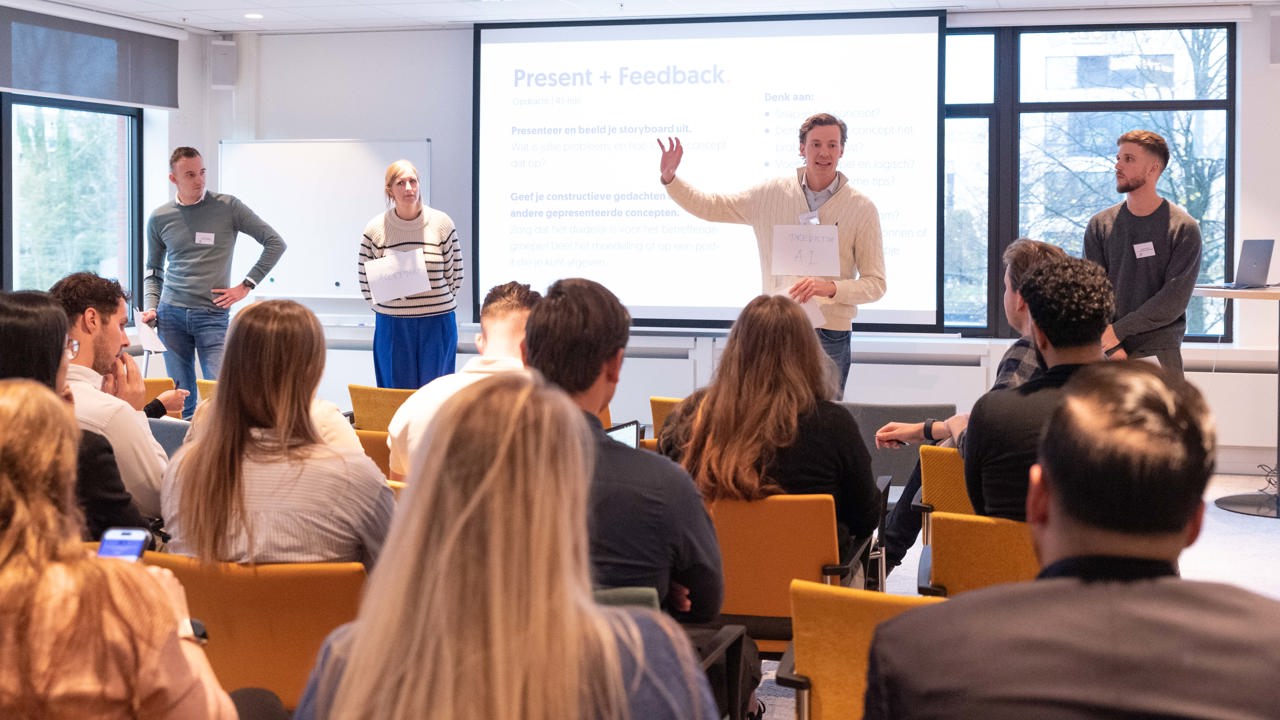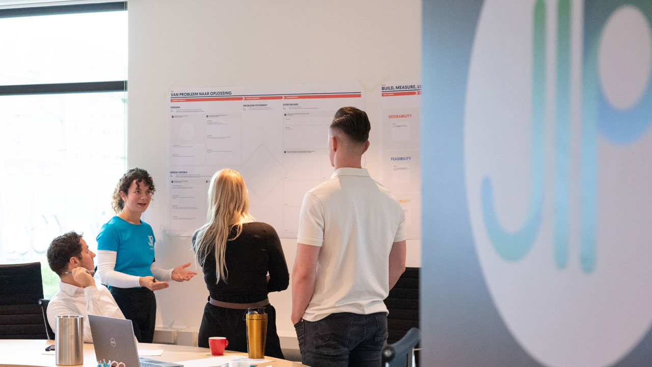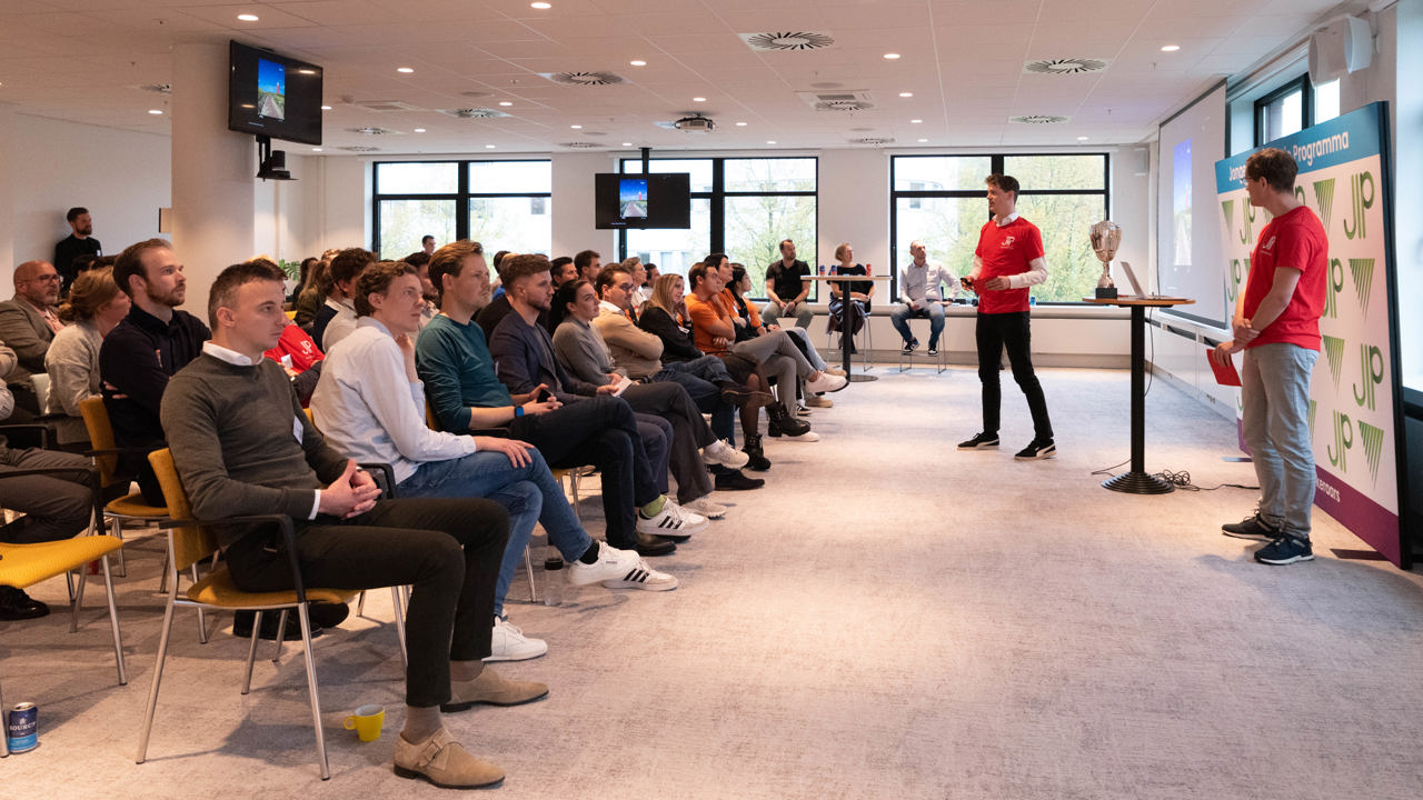 De training, dit jaar in de vorm van een driedaagse hackathon, werd vrijdag 15 november afgesloten met de pitches van de 6 multidisciplinaire JIP-teams. Daarna konden de bezoekers de AI-tools zelf uitproberen om vervolgens te stemmen op hun favoriet. Aan Geeke Feiter, directeur Schade van het Verbond, de eer om de prijs uit te reiken aan de innovatie met de meeste stemmen. Een week eerder heette ze de groep al welkom bij het Verbond. Nu zag ze de uitkomst van het innovatieproces dat de JIP’ers in 72 uur hadden doorlopen: