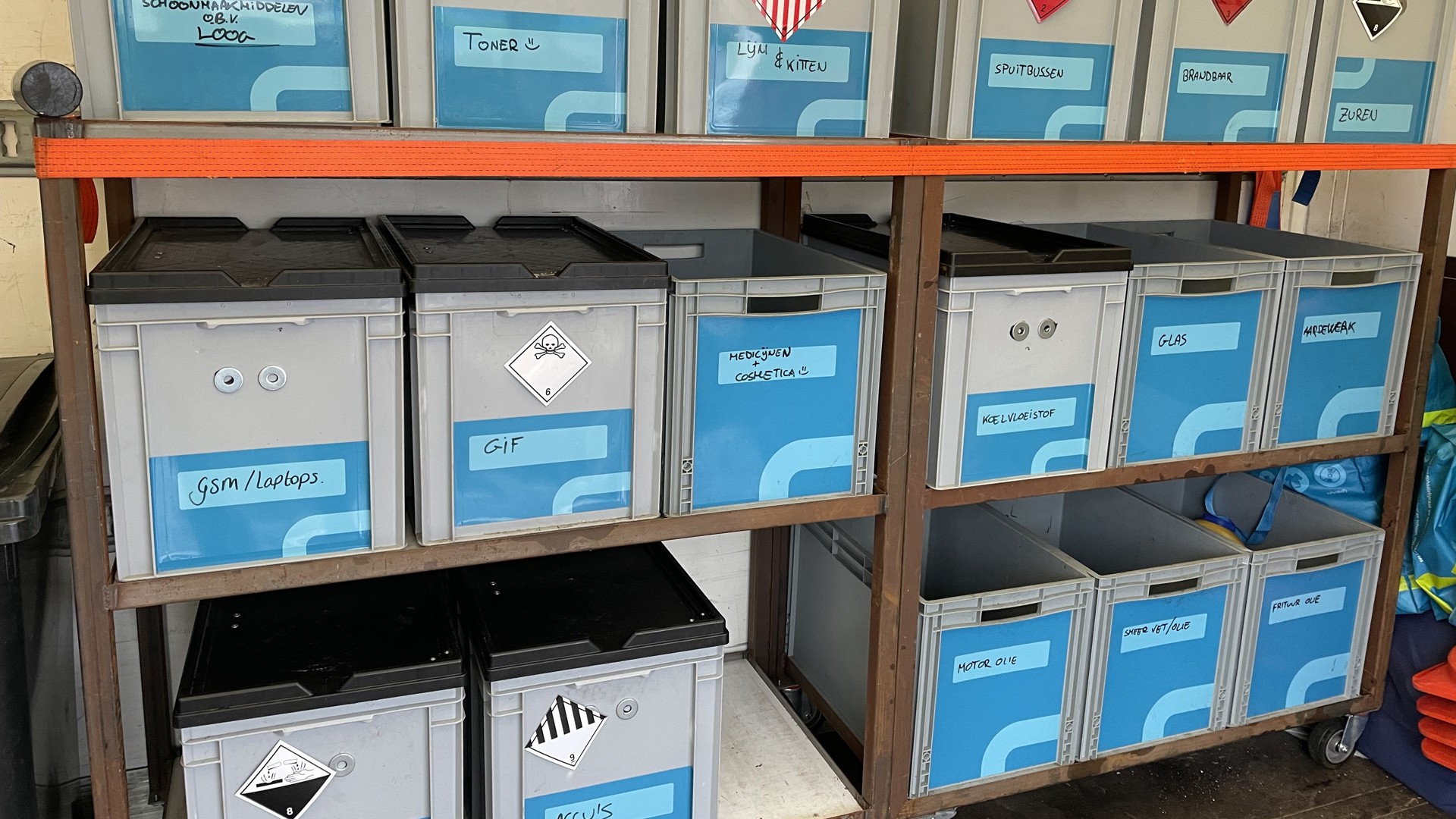 Mathijs en Arjan weten wat ze doen. Beiden mogen gevaarlijke stoffen vervoeren en Mathijs heeft daarnaast de opleiding voor KCA-medewerker doorlopen (KCA = Klein Chemisch Afval). Arjan is nog met die opleiding bezig en vindt het “niet verkeerd” om weer te leren. “Ik werk normaal gesproken op het milieuplein. In de training gaan we dieper in op wat wat is. Uiteraard ken ik alle logo's van de brandbare vaste stoffen al uit mijn hoofd. Die logo's staan ook op de voorkant van de boxen in de Recyclewagen en zijn genummerd, van 1 tot en met 9.”