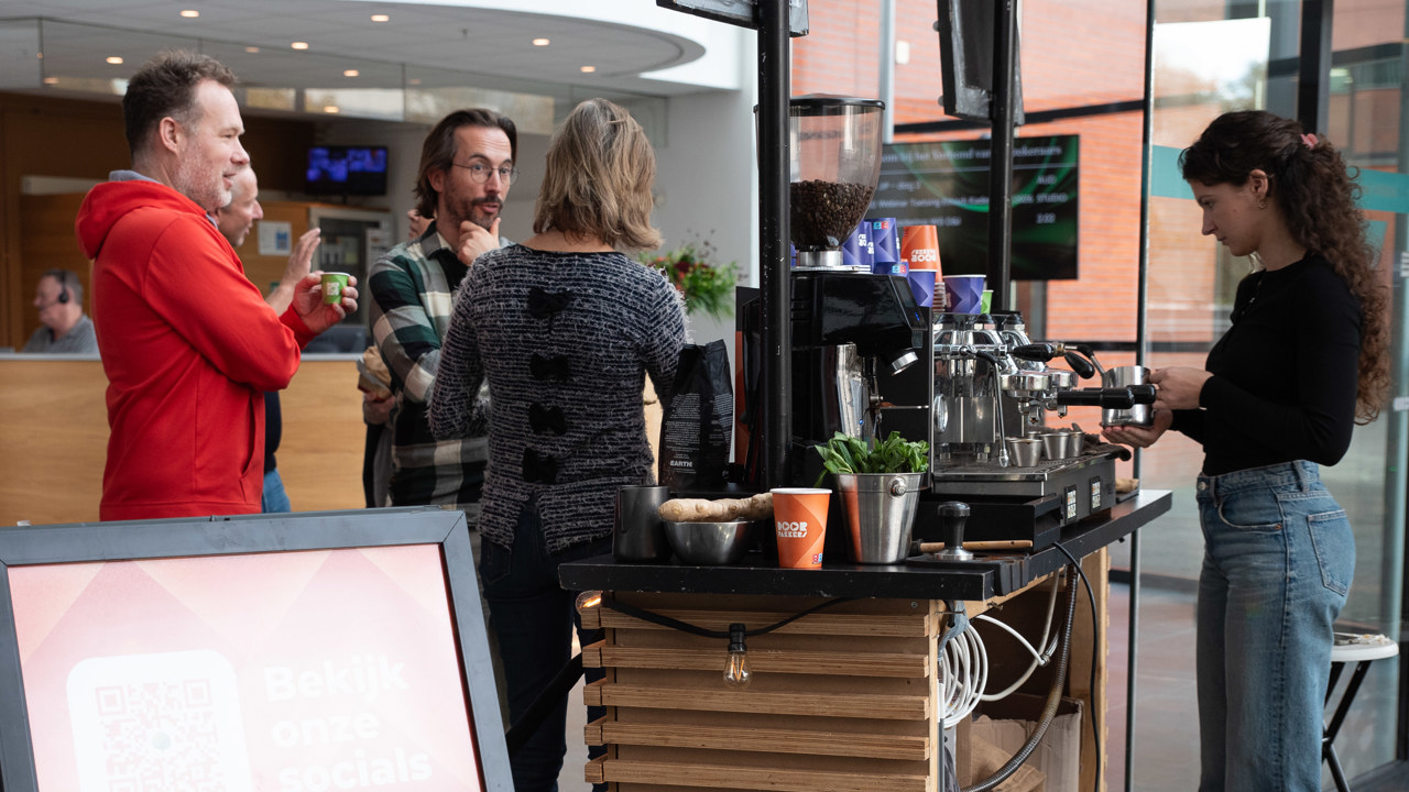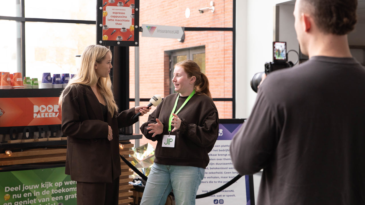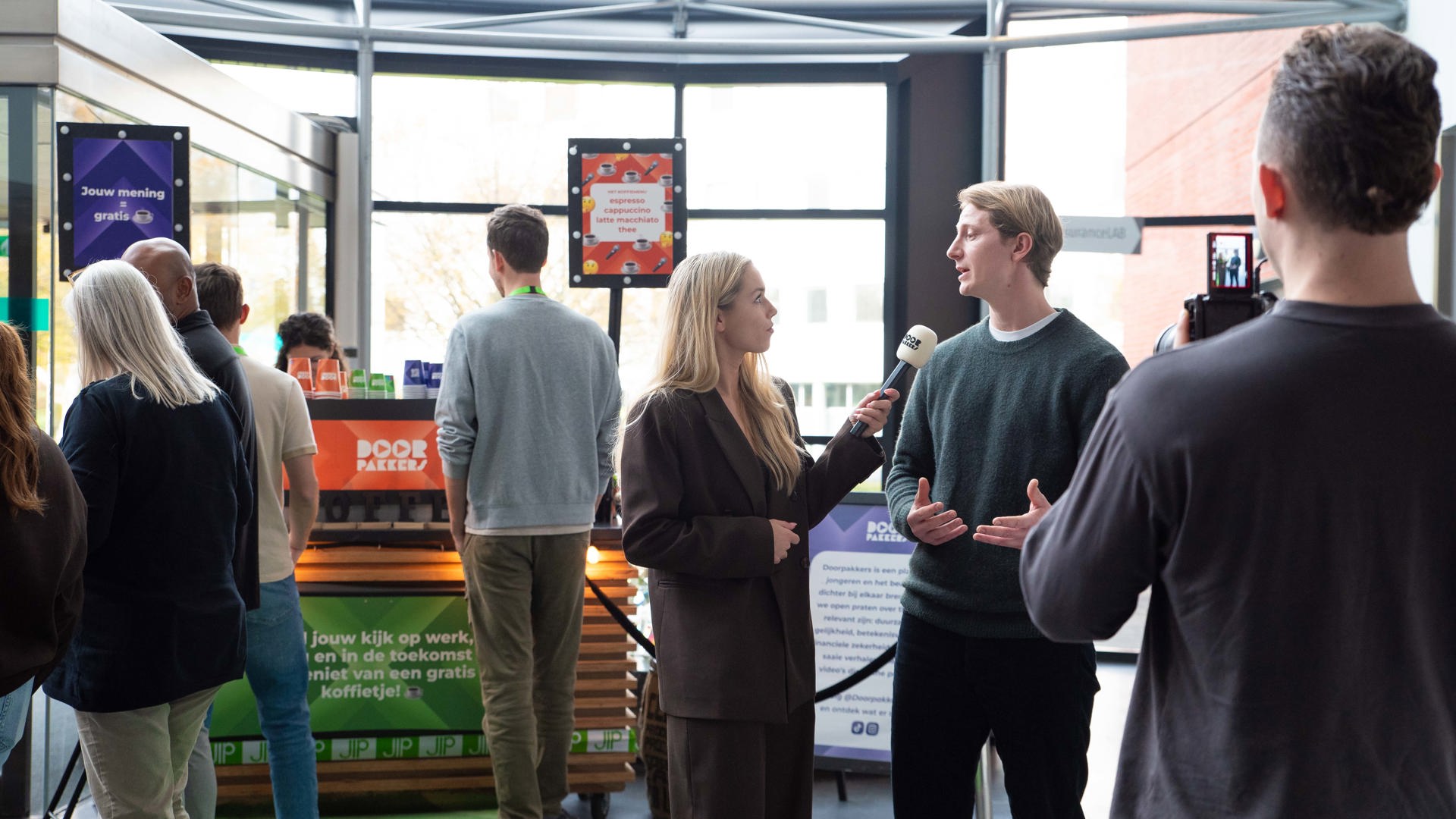 De koffiebar stond er niet zomaar: het bezoek van Doorpakkers werd namelijk gekoppeld aan de hackathon van het Jongeren Innovatie Programma (JIP). Terwijl de deelnemers genoten van hun cappuccino of espresso, ging Doorpakkers met ze in gesprek over hun visie op de toekomst van werk en verzekeren.