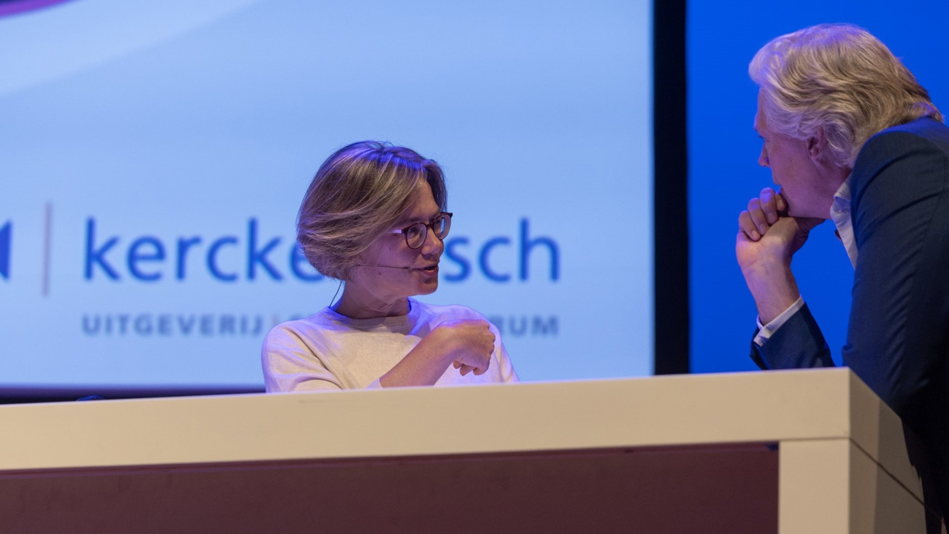 Verbondsdirecteur Geeke Feiter wordt geïnterviewd door dagvoorzitter Roelof Hemmen
