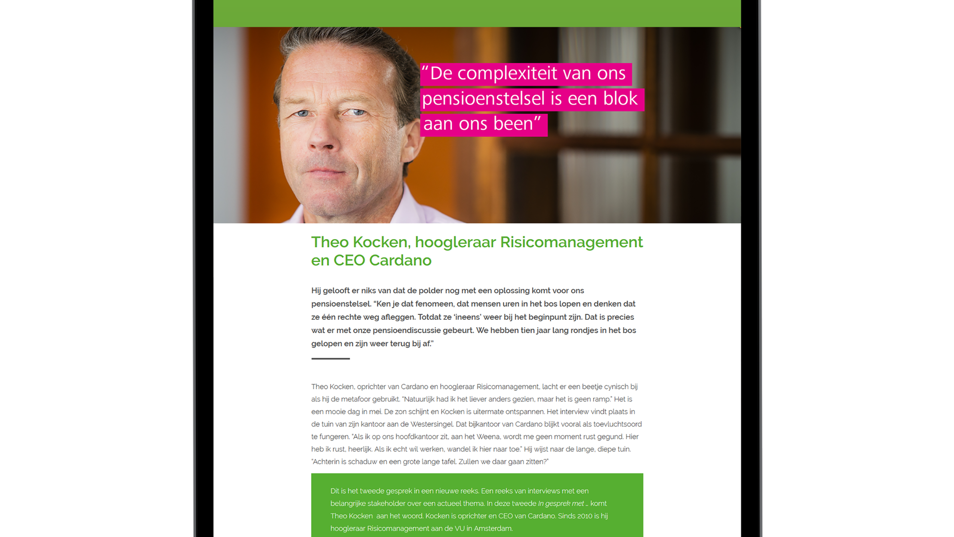 Theo Kocken, hoogleraar Risicomanagement en CEO van Cardono, neemt de lezer mee naar zijn wereld van spaarpotten, persoonlijke pensioenplannen en de polder. Het volledige interview is hier te vinden.