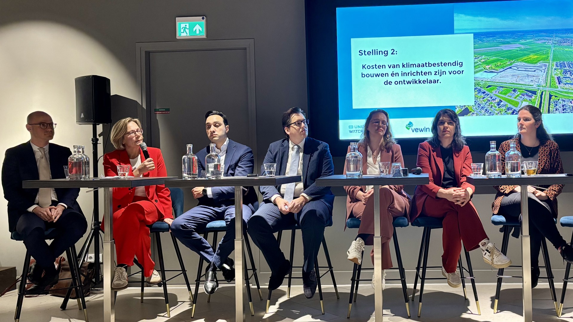 Has Bakker (Gedeputeerde Provincie Utrecht), Fahid Minhas (directeur NEPROM), Marieke Vellinga-Beemsterboer (Tweede Kamerlid D66), Ines Kostić (Tweede Kamerlid Partij voor de Dieren), Pieter Grinwis (Tweede Kamerlid ChristenUnie), Lies van Aelst (Eerste Kamerlid SP) en Geeke Feiter debatteerden over onder meer de stelling dat de kosten van klimaatbestendig bouwen en inrichten voor de ontwikkelaar zijn. Luisterend naar de aanwezige Kamerleden en kijkend naar verkiezingsprogramma’s is Feiter positief gestemd dat het komende kabinet met landelijke normering aan de slag gaat.