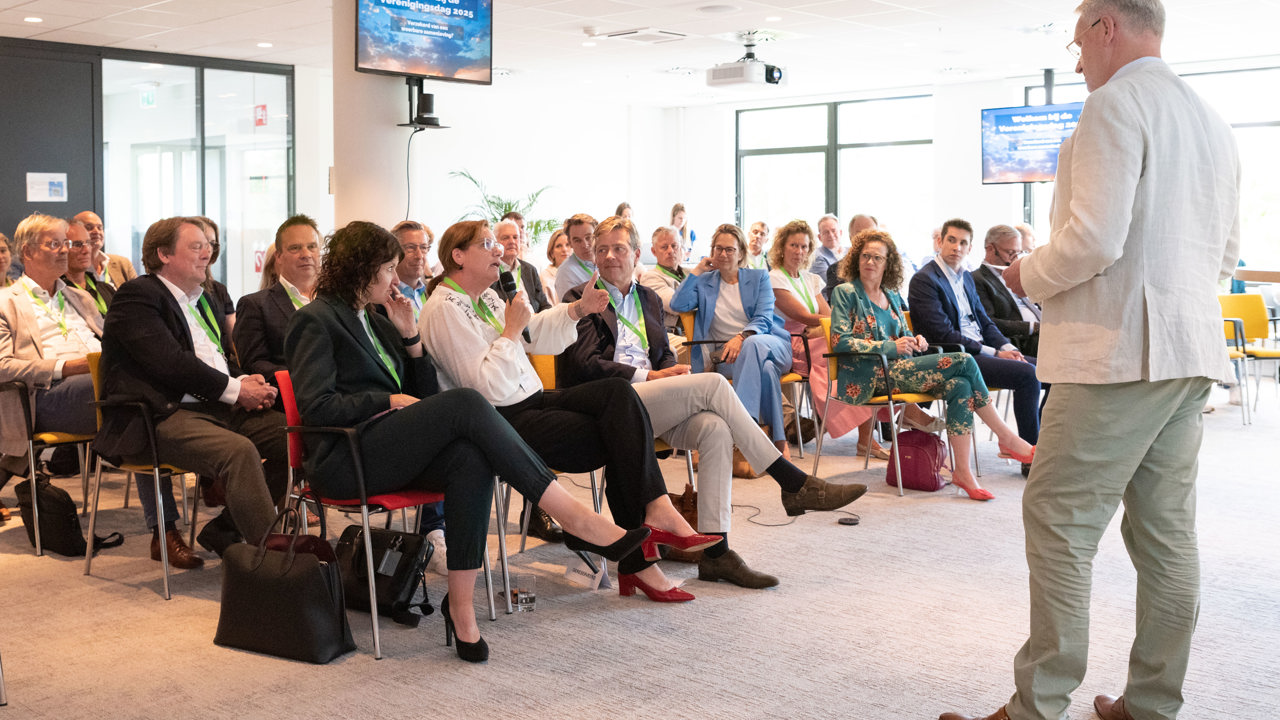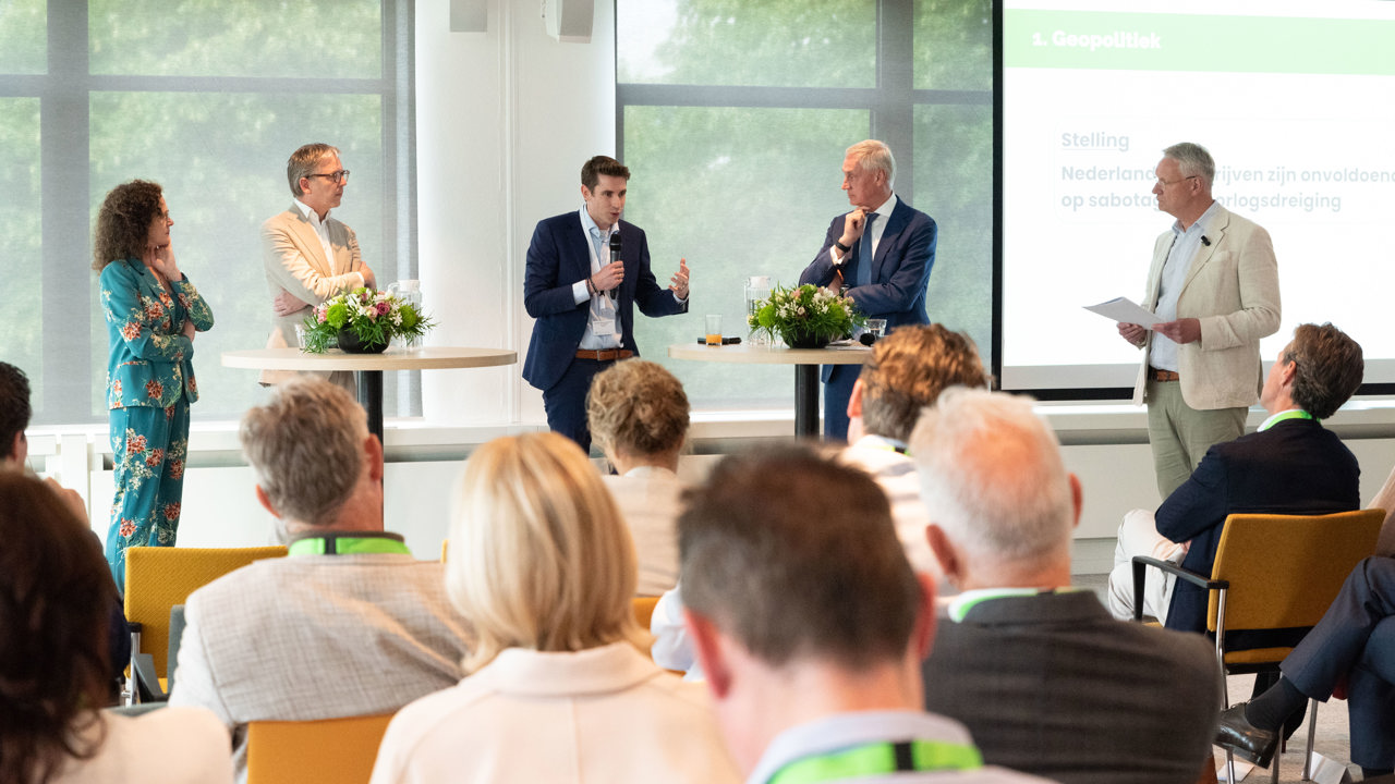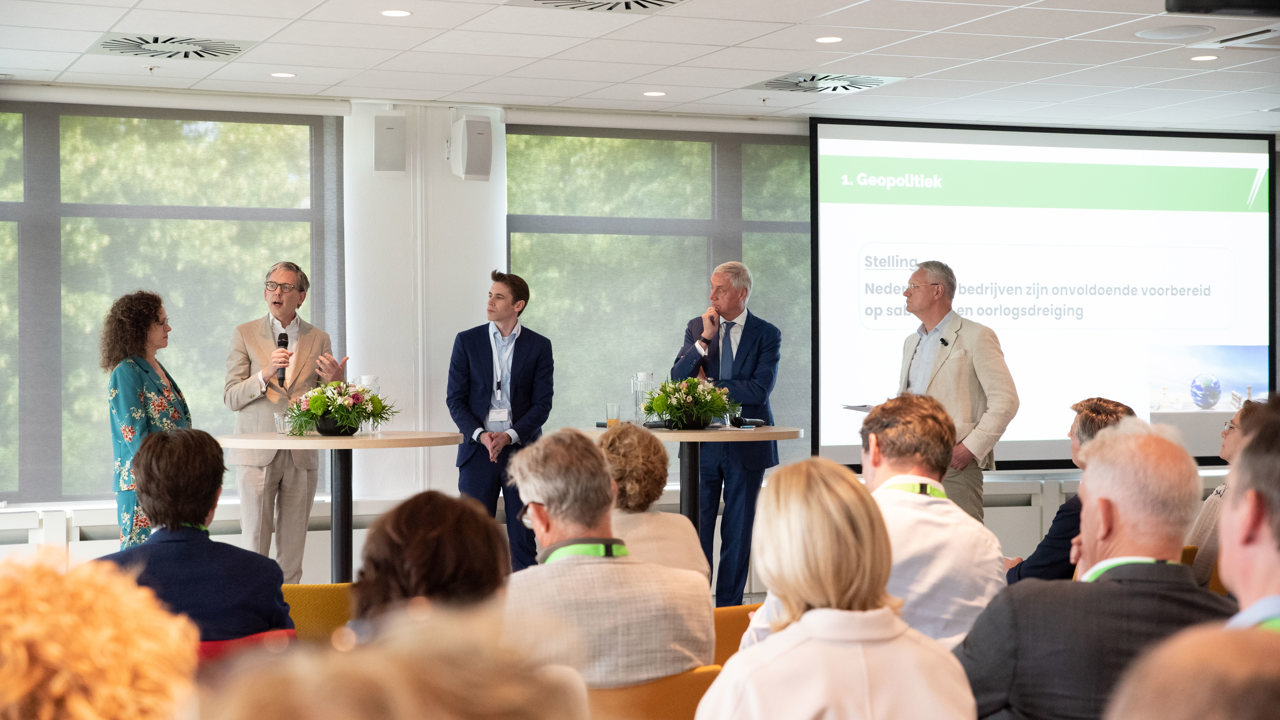 Richard Weurding, algemeen directeur van het Verbond van Verzekeraars, prikkelt het panel met stellingen en vragen over weerbaarheid. De deelnemers Jos Baeten (Voorzitter Verbond van Verzekeraars), Sophie in ’t Veld (tot voor kort Europarlementariër), Hendrik Schimmelpenninck van der Oije (Executive Consultant van Verbondspartner Fox-IT) en Focco Vijselaar (Algemeen directeur van VNO-NCW) mochten meteen aan de slag met de stelling: Nederlandse bedrijven zijn onvoldoende voorbereid op sabotage en oorlogsdreiging.