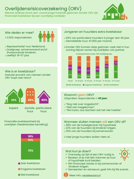 Het overlijdensrisico bij jongeren is gelukkig laag, maar de financiële impact van het wegvallen van een partner is juist groot. Op vragen waarom geen voorziening voor overlijden is getroffen, wordt door respondenten vaak geantwoord met “nog niet over nagedacht’’ of ‘’ik dacht dat het bij huur niet nodig was’’. Over de prijs van een ORV bestaat veel onbekendheid. Herbert: “Veel mensen weten niet dat ze zich voor een tientje per maand al voor een aanzienlijk bedrag kunnen verzekeren.” Het Verbond van Verzekeraars is in overleg met onder meer de Consumentenbond over hoe het bewustzijn van dit risico kan worden vergroot.