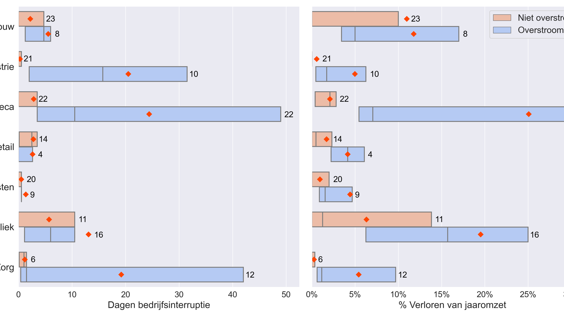 Verdeling van de bedrijfsinterruptie (links) en verloren jaaromzet (rechts) per economische sector na de overstromingen in Limburg in 2021.