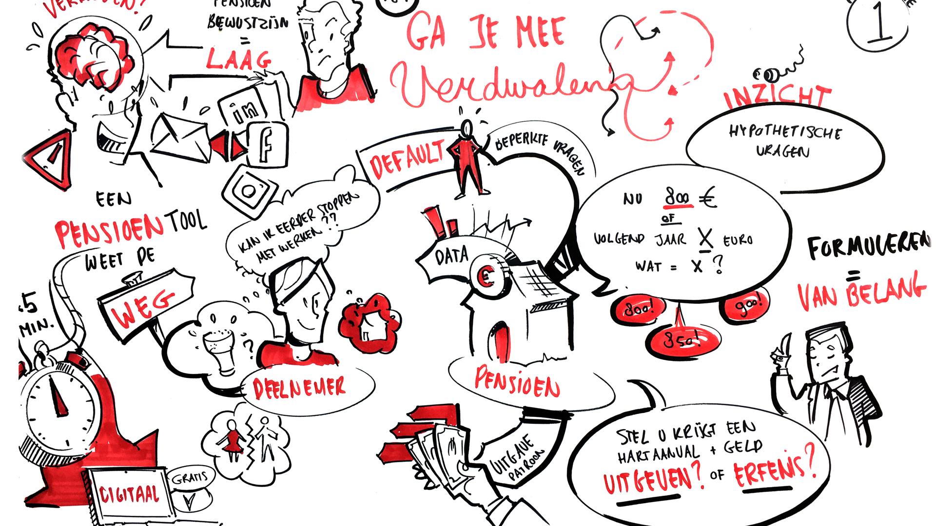In het laatste geval werkt een tool beter en daarom was Mladen Sancanin van PGGM bij de sessie aanwezig. Hij presenteerde de Toekomstverkenner, waarmee het klantcontact van het pensioenfonds een nieuwe impuls krijgt. In vijf minuten krijgt de deelnemer een antwoord op de vraag of hij/zij eerder kan stoppen met werken of minder kan gaan werken. “Ik geloof heilig in microvragen. Als ik van Utrecht naar Den Haag reis, krijg ik van Google toch ook niet eerst een kaart van heel Nederland.” Als het aan Sancanin ligt, wordt de Toekomstverkenner niet alleen uitgebreid met meer vragen (bijvoorbeeld over echtscheiding), maar ook met meer pensioenfondsen. “De intentieverklaring is al onderweg.”