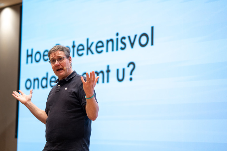 Hij kijkt aandachtig de zaal in. “Als jullie de stap willen zetten van minder erg naar meer goed, dan lukt dat alleen als jullie anders (leren) kijken naar waarde.”