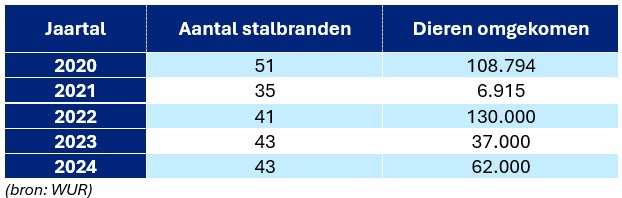 “Kijkend naar het aantal stalbranden zien we in de periode 2020 - 2024 niet zoveel verschil, maar wel in het aantal omgekomen dieren. Dat is te verklaren door pluimveebedrijven. Daarbij worden vaak veel dieren getroffen”, legt Brasjen uit.